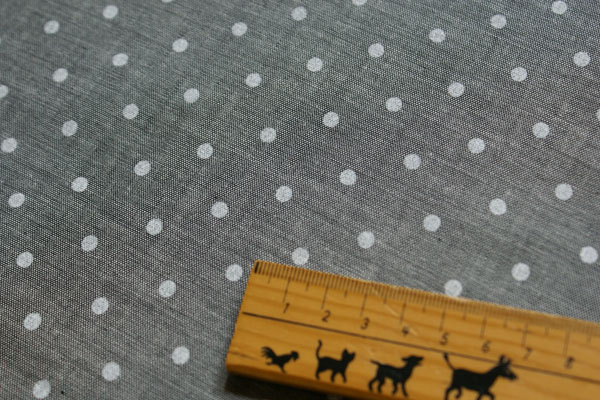 約5mmのドットがプリントされたダンガリー生地です。 厚みは厚くも薄くもなく、一般的な生地の厚みです。 サラッとした肌触りで、着心地の良いウェアーになりそうです(*^^*) バッグ等の布雑貨やインテリアにもいいですよ♪