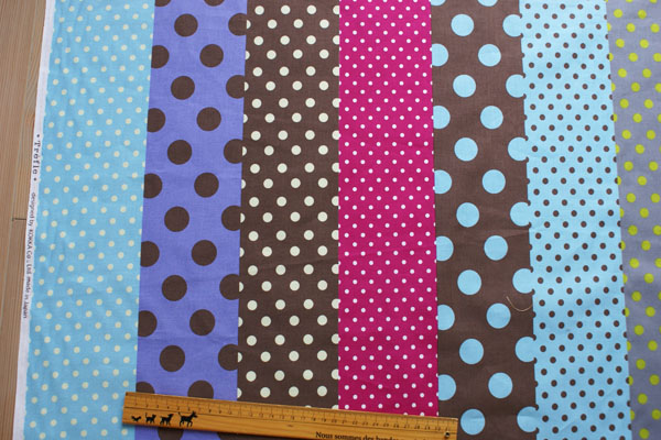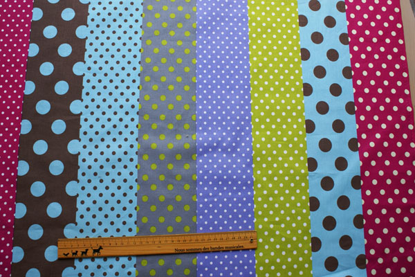 11種類のドットが組み合わさった、とてもかわいいストライプパッチです。 ドットの大きさも4mm〜2.5cmとバリエーション豊か。 一枚で何通りも楽しめて、お得感もワクワク感もバッチリです! ひと柄は約9.5cm前後で、ほぼ同じ幅のストライプです。 ギャザーを寄せて簡単パッチスカートも素敵ですね♪ 芯地を貼ってバッグにしたり、裏布にも良いですね(*^^*) 使い方次第でいろいろ楽しめますよ♪