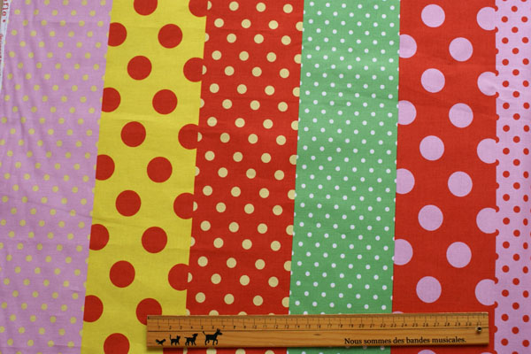 11種類のドットが組み合わさった、とてもかわいいストライプパッチです。 ドットの大きさも4mm〜2.5cmとバリエーション豊か。 一枚で何通りも楽しめて、お得感もワクワク感もバッチリです! ひと柄は約9.5cm前後で、ほぼ同じ幅のストライプです。 ギャザーを寄せて簡単パッチスカートも素敵ですね♪ 芯地を貼ってバッグにしたり、裏布にも良いですね(*^^*) 使い方次第でいろいろ楽しめますよ♪