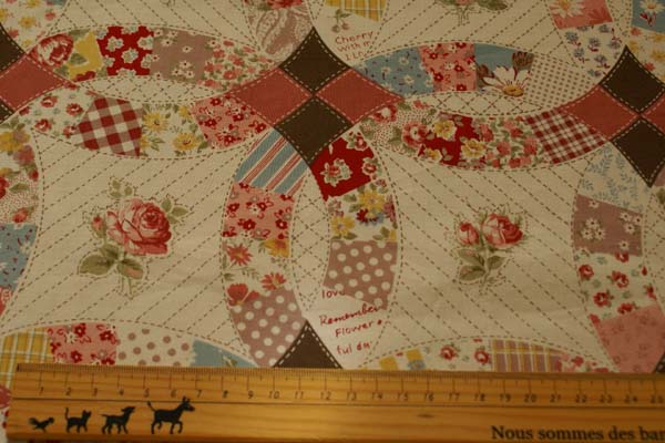 数多くあるパターンの中でも人気のダブルウェディングリングのプリントです。 一枚一枚つなぎ合わせるのは大変ですが、 こんなプリントがあれば、キルト綿を挟んで なんちゃってキルトもすぐ作れちゃいますね! キルトにしなくても、そのままクッションカバーや テーブルクロス等、インテリアにも素敵です(*^^*) リングの大きさは、直径約23pです。