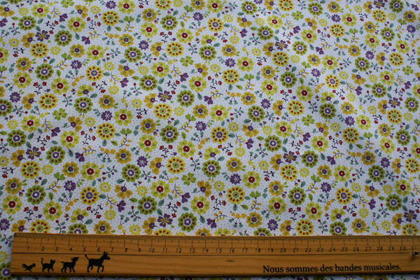 コロンとした、まあるいキュートなお花と小さなドットが とってもかわいいプリント生地です。