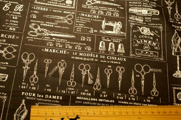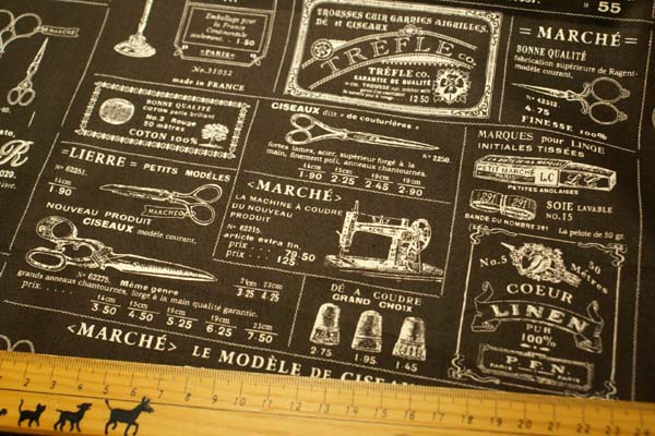 小関鈴子さんデザインのソーインググッズが満載の アンティーク風なプリントです。 扱いやすい厚みで、パッチワークや布雑貨等いろいろ活用してくださいね♪