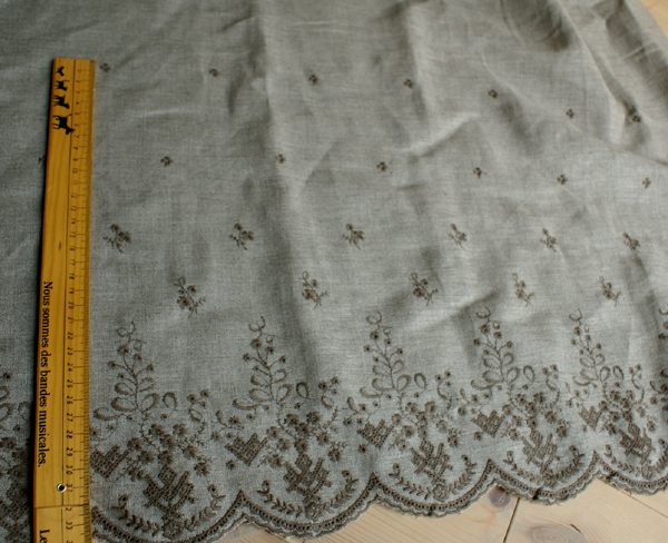 片側約35センチに刺繍&スカラップが施された、 とても上質なリネン100%の生地です。 厚みは中厚程度の厚さでで、透け感もなく、幅もたっぷりありますので、 無駄なく使って頂けます。