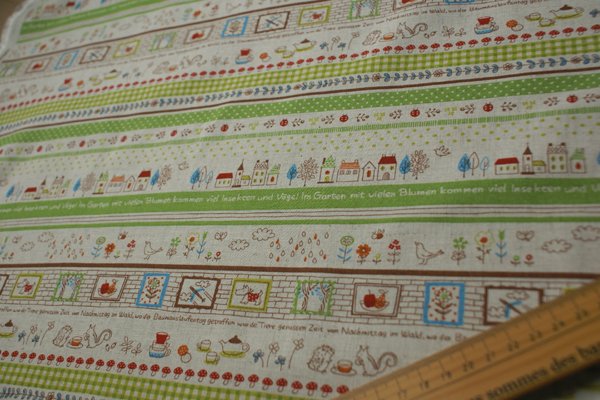 厚みは普通地程度の厚さで、生地幅に対してボーダー状に柄がプリントされています。