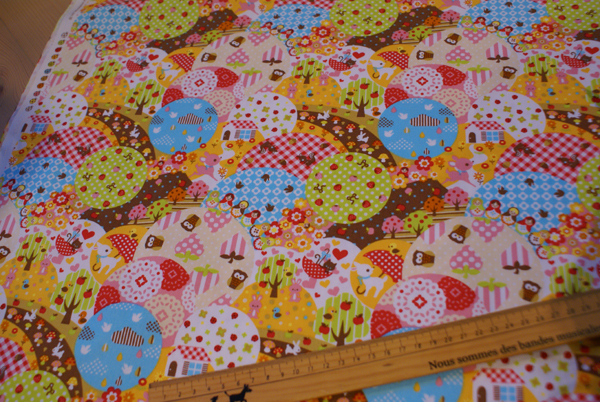 マトちゃん、うさぎ、バンビにいちごやきのこ。。。。 かわいいツボがいっぱいです(笑)。 サークルパッチがまた良い感じで、しつこくなりそうな柄が 上手く調和されて、見ているだけで楽しいプリントです。 バッグやインテリアにいかがですか〜。 生地はオックス地です。