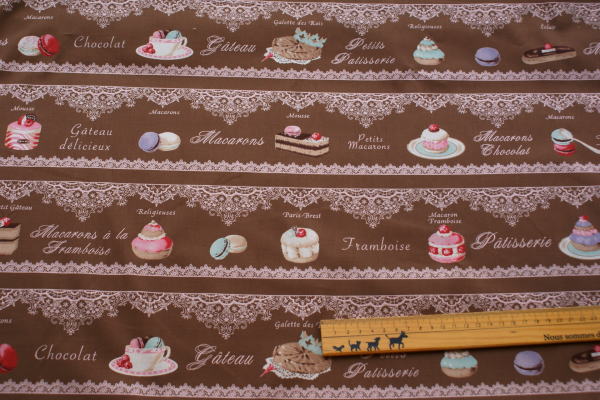 カラフルでおいしそうなスウィーツがいっぱいのキュートな生地です。 レース部分は抜染プリントをしているので、柄がはっきりでて、 スィーツ柄の発色もきれいで、気品さも感じられます。 バッグやポーチの布雑貨にかわいいですね(*^^*) カーテンにしても素敵♪