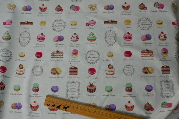 カラフルでおいしそうなスウィーツがいっぱいのキュートな生地です。 スィーツ柄の発色もきれいで、気品さも感じられます。 バッグやポーチの布雑貨にかわいいですね(*^^*) カーテンにしても素敵♪