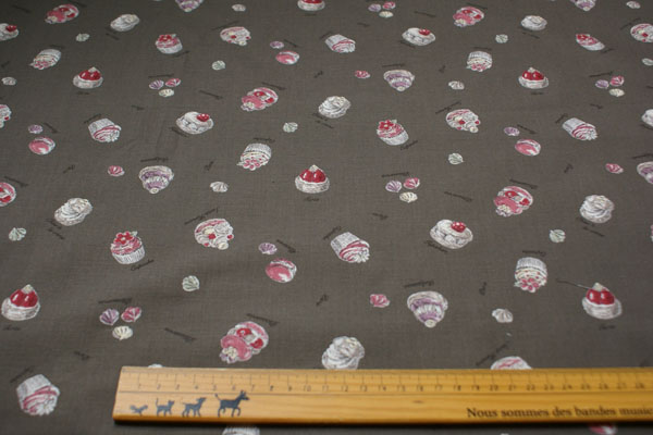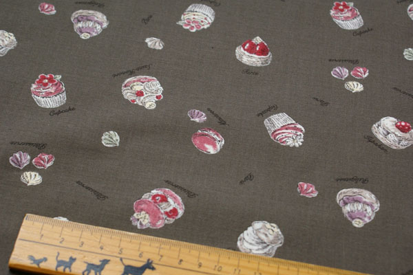 マカロンやカップケーキにシュークリームetc.... 美味しそうなプチフルーツがいっぱいです♪ あまいテイストになりがちなスウィーツ柄ですが 少し大人っぽさも感じられる、大人かわいい生地になってます。 エプロンやバッグ、ポーチ等いろいろ作ってくださいね(*^^*)