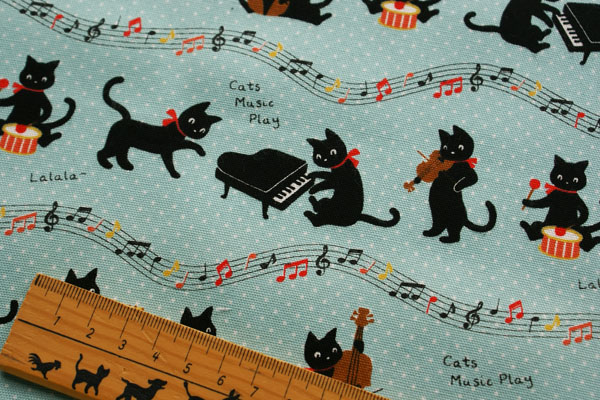 かわいい黒ねこちゃんのコンサート。 かわいい音色が聞こえてきそうですね♪ ねこちゃん好きにはたまりませんね! バッグやポーチ等の布小物はもちろん クッションカバー等のインテリアにも良いですよ(*^^*)