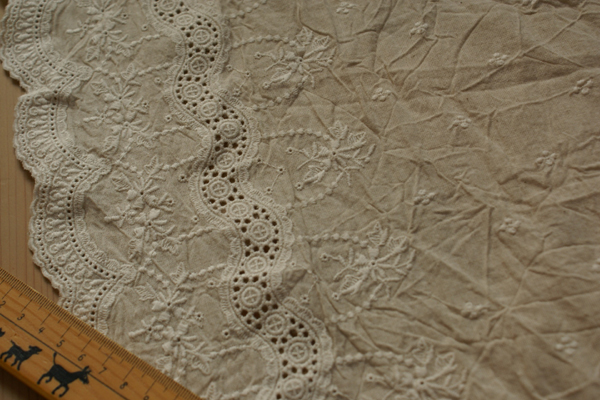 片みみがスカラップ加工された、 薄いベージュ系のリネンカラーの生地です。 ドット風の刺繍もスカラップ部分から約108p部分までされており、 ナチュラルながら上品なスカラップレースです。 ワンピースやチュニック、ぺチパンツにペチスカート等 作りたい物を考えるだけで幸せ気分です〜。