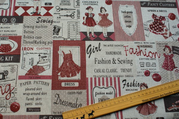 ミシンにアイロン、はさみ等のソーインググッズや クラッシックなお洋服に女の子がプリントされた レトロチックな雰囲気の懐かしさが漂う生地です。