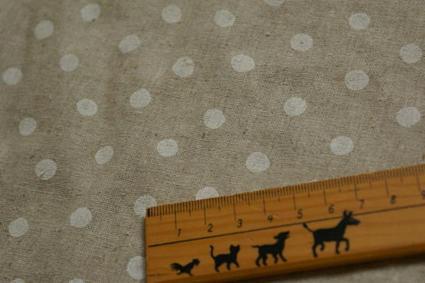 麻混のざっくりした生地にドットがプリントされています。 やわらかい手触りになる加工を施していますので バッグ等の雑貨類やウェアーにもどうぞ♪ 鳥のプリントと合わせて、バッグインバッグを作ってみました(*^^*