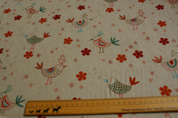 麻混のざっくりした生地におとぼけなとりがプリントされています。 昨年販売されて、即完売した人気の生地です。 やわらかい手触りになる加工を施していますので バッグ等の雑貨類やウェアーにもどうぞ♪ ドットのプリントと合わせて、マルシェバッグを作ってみました(*^^*