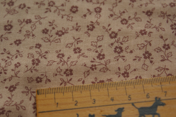 サーモンピンク系の地色にブラウンがかったパープルの小花がプリントされています。 柄が強調されすぎないので、とても使いやすいです。