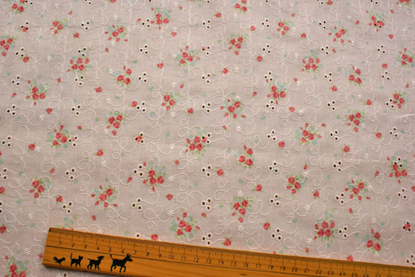 お花がプリントされたキュートな綿レースです。 キャミソールやワンピース、ボレロにしてもかわいいですね。 布小物にもいいですよ♪